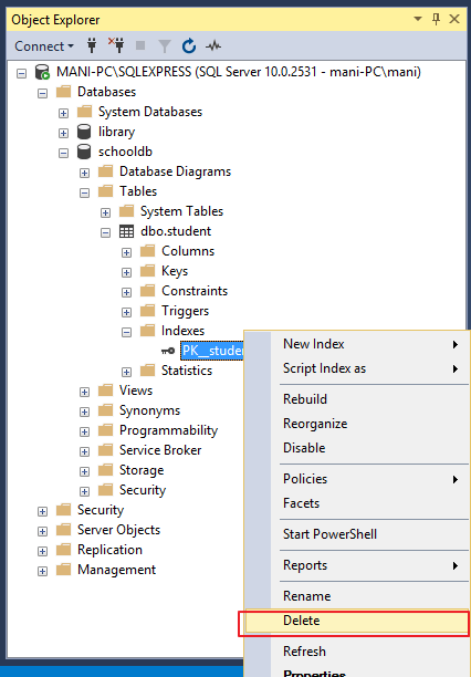 To delete an index go to “Object Explorer-> Databases-> Database_Name-> Tables-> Table_Name -> Indexes”. Right click the index that you want to delete and select DELETE. See the below screenshot.