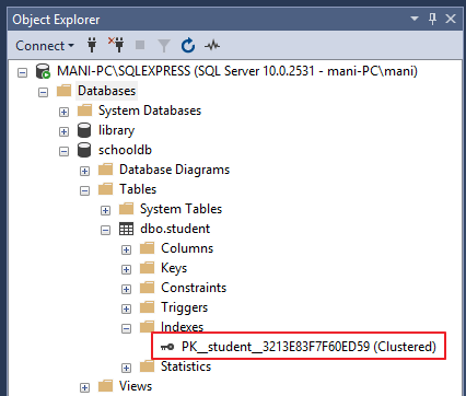 Notice here in the “student” table we have set primary key constraint on the “id” column. This automatically creates a clustered index on the “id” column. To see all the indexes on a particular table execute “sp_helpindex” stored procedure. This stored procedure accepts the name of the table as a parameter and retrieves all the indexes of the table. The following query retrieves the indexes created on student table.